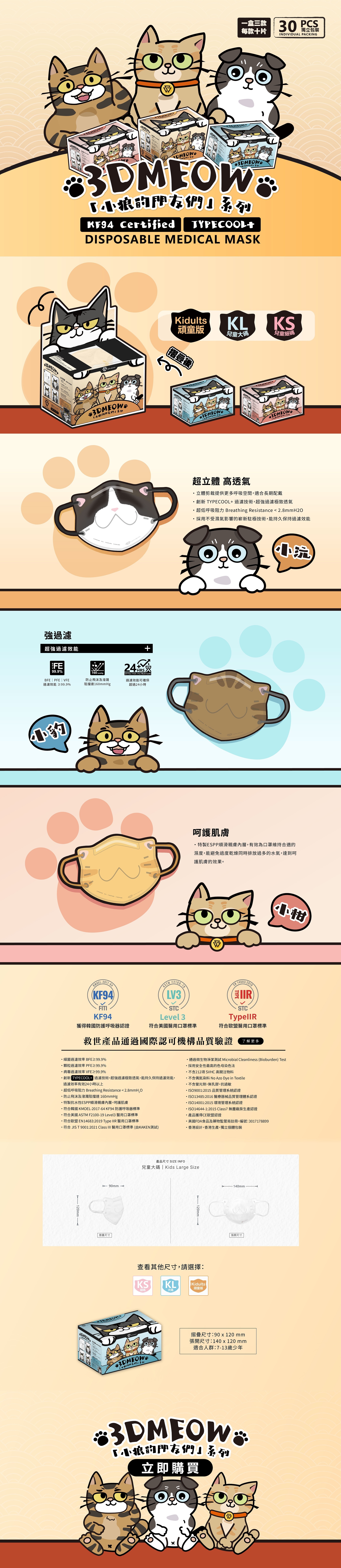除咗一直陪伴住小狼左右嘅大哥小豹,今日為大家隆重介紹另外兩位貓喵朋友,分別係天生麗質,喵界嘅女神小柑,同人見人愛天然呆直嘅小沅!三款立體喵系列均與一般立體喵系列一樣,獨家超立體剪裁令你戴得舒適, 與及秉承Typecool+過濾技術,有著強過濾、高透氣嘅極致特性!三款極可愛嘅小狼朋友們必令小朋友毫無抵抗力乖乖戴上,我哋仲特地加設少量嘅頑童版,令大人都可以一齊萌,以上均為別注款式限量發售,欲購從速喇!