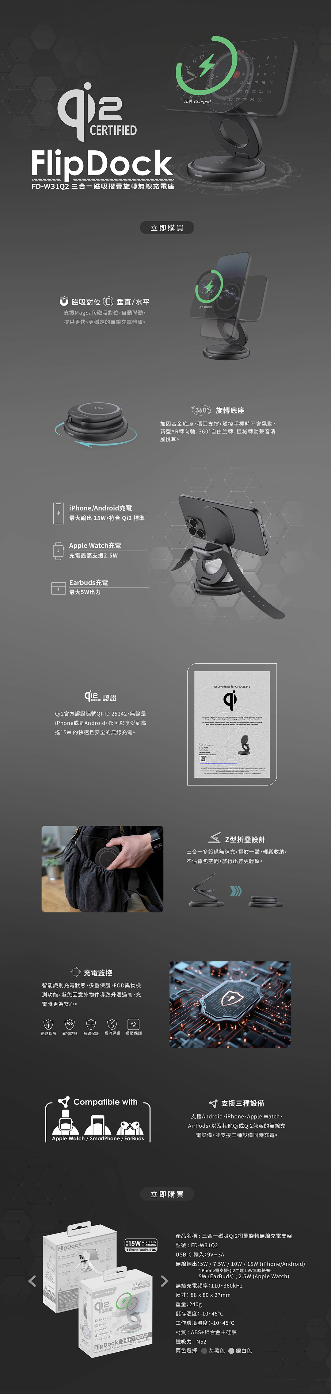 ⭐三合一設計:支援Android 、iPhone、Apple Watch、AirPods,以及其他Qi或Qi2兼容嘅無線充電設備,並支援三種設備同時充電。