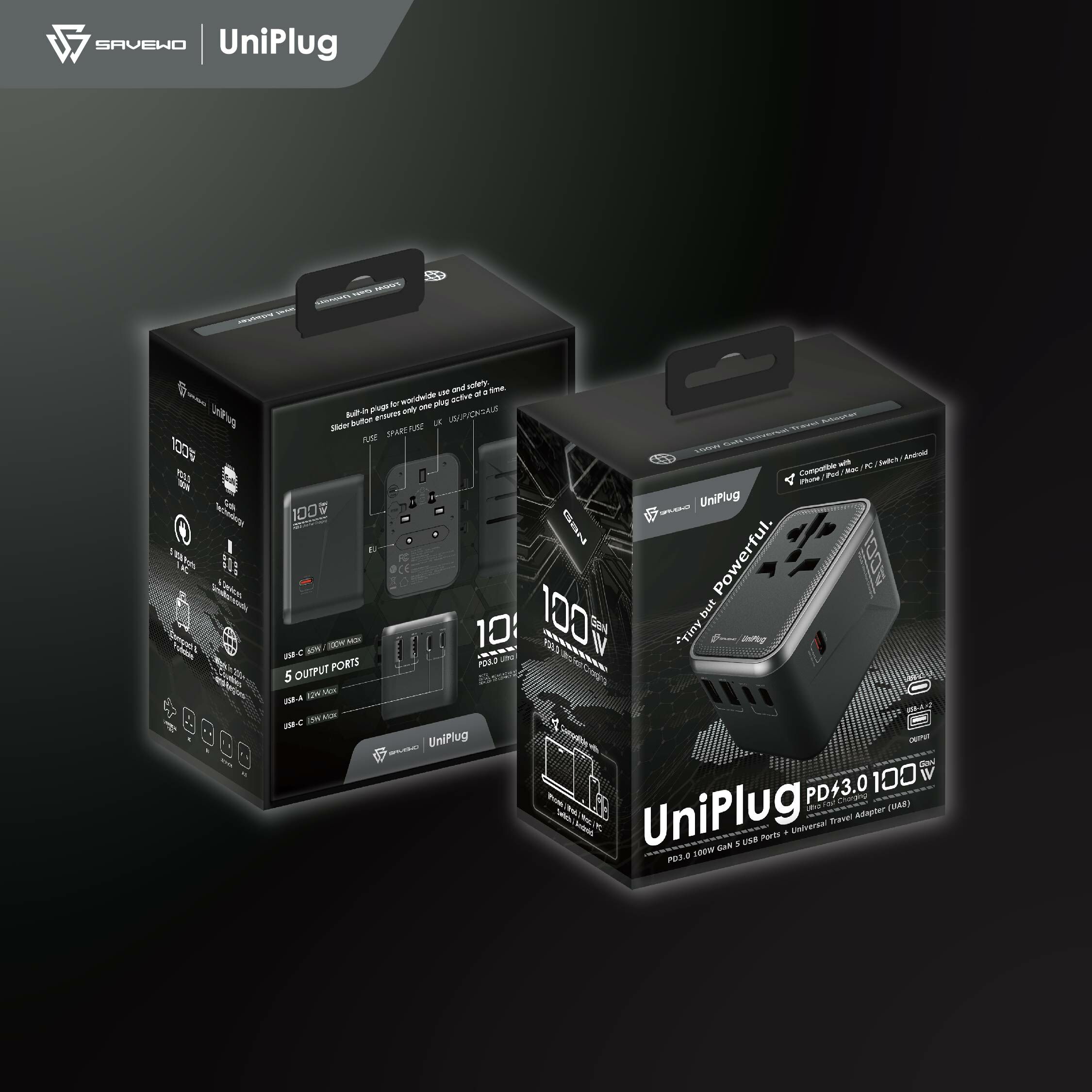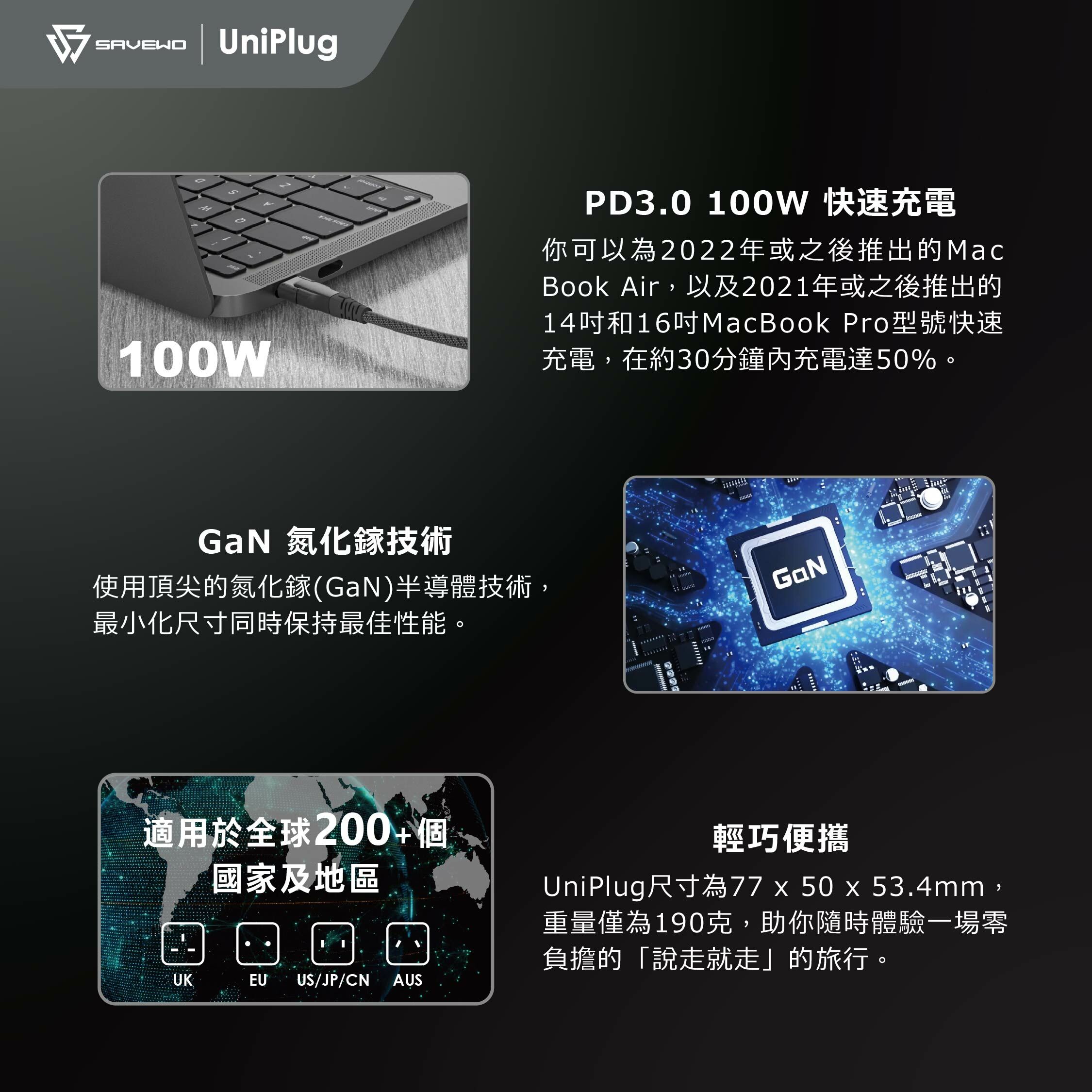 配備可更換的插頭頭設計,適用於超過 200 個國家,包括 UK、EU、US/JP/CN、AU 等標準。