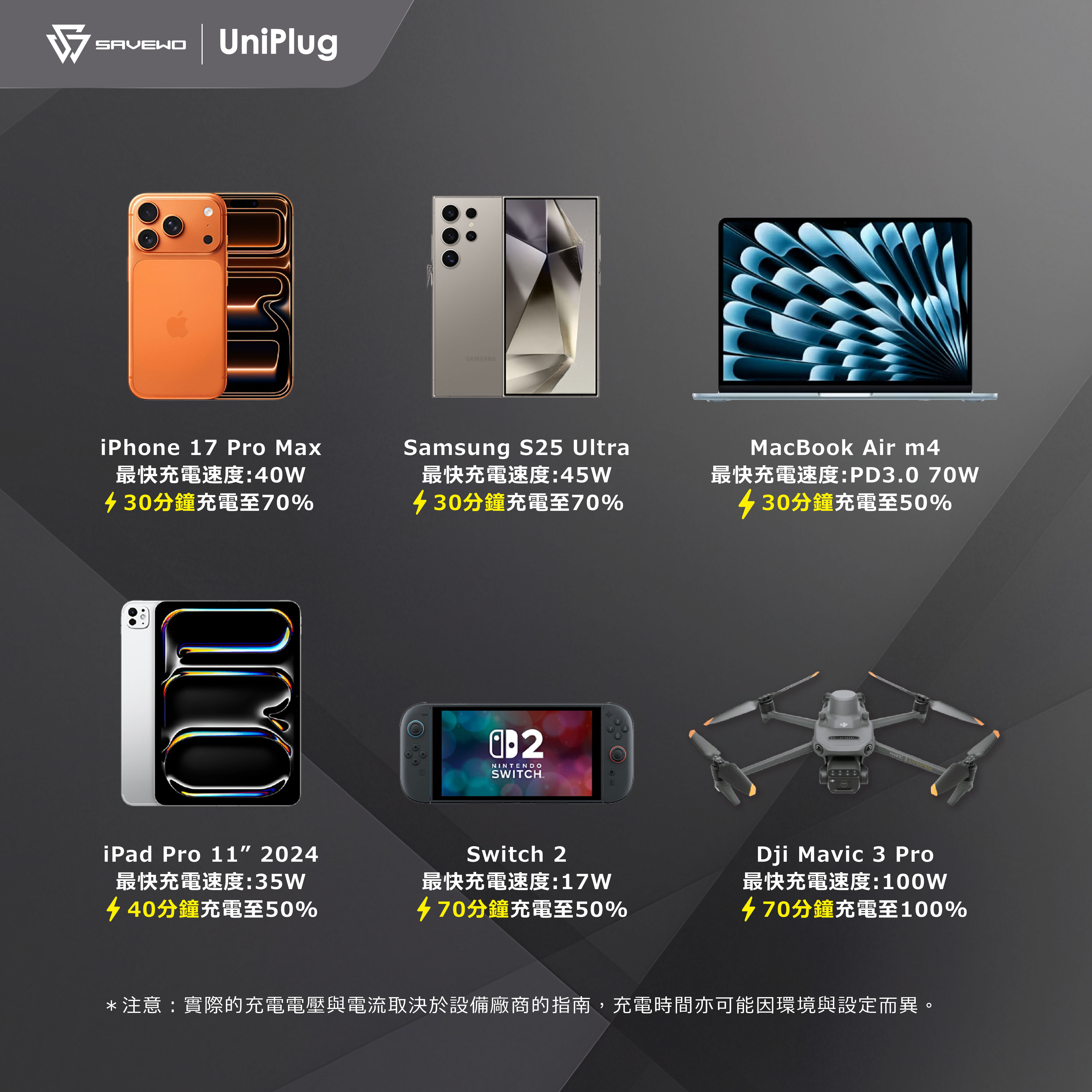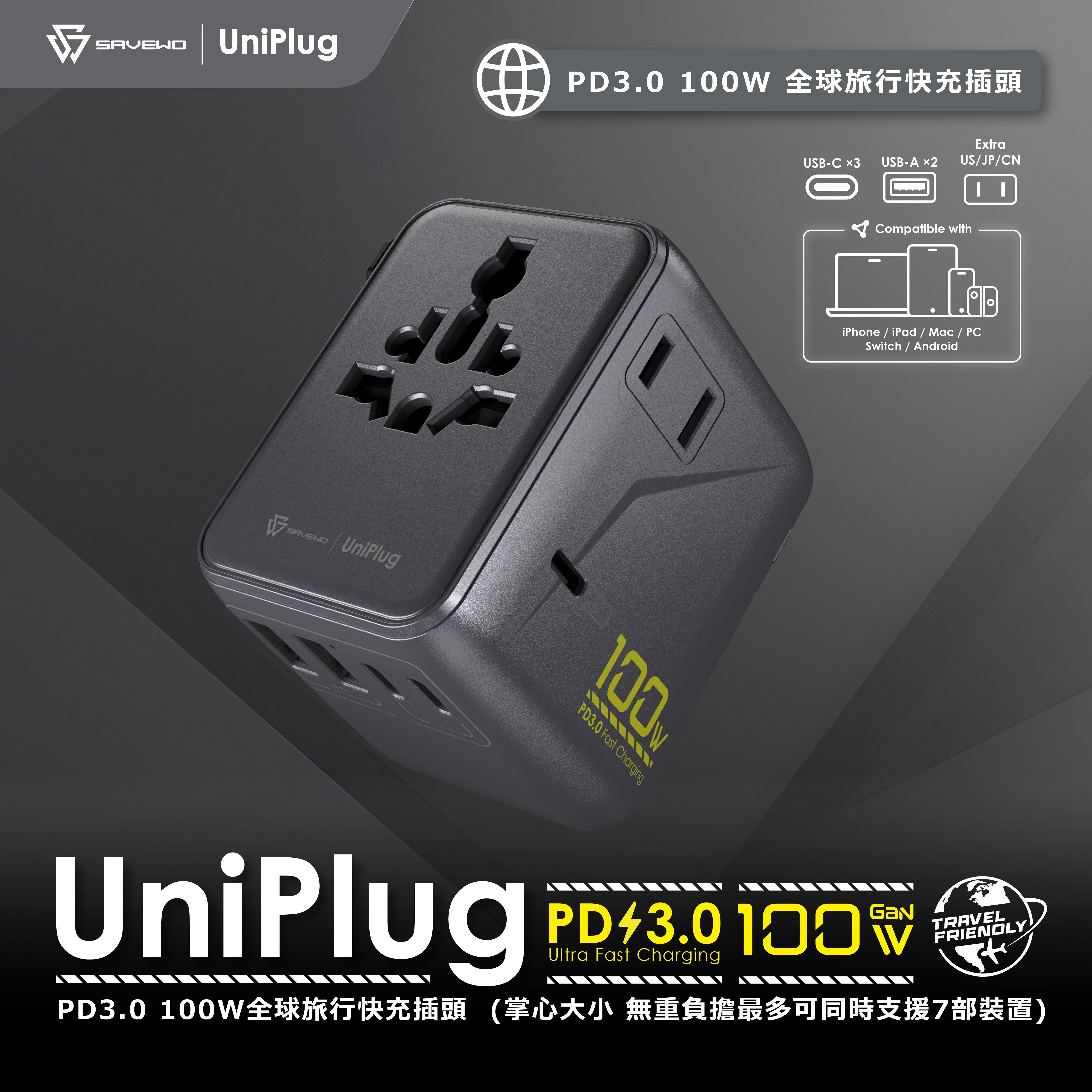 經常出差周遊列國?你需要一個既輕便又強勁嘅充電夥伴!SAVEWO Uniplug UP100S 專為旅行者設計,體積細小但性能強悍,支援 PD 100W 高速充電,輕鬆應付手機、平板、筆記本電腦等多種設備。