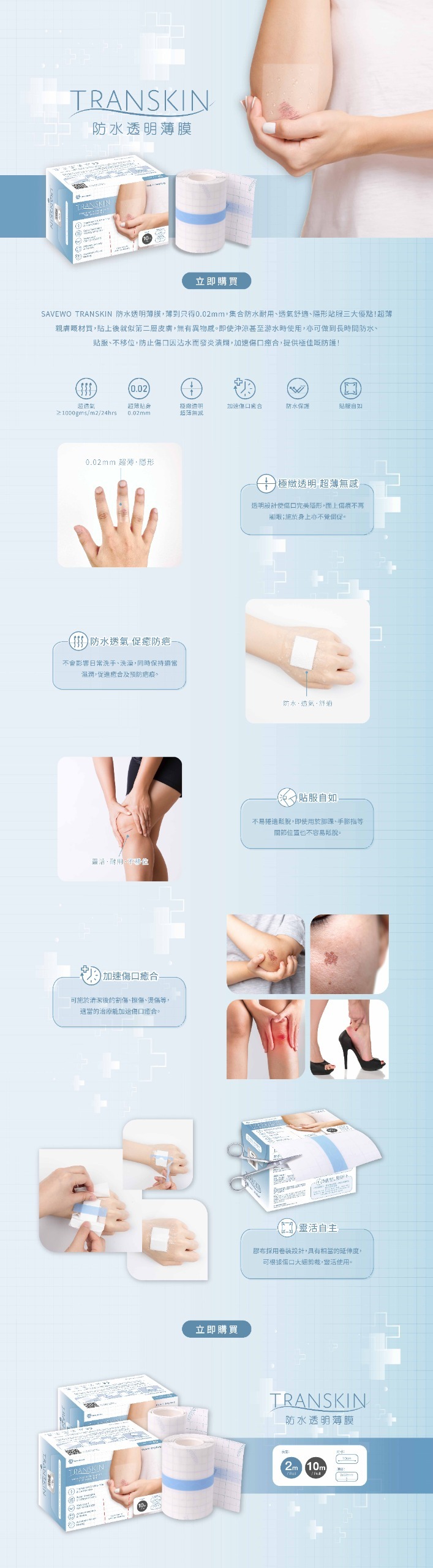 SAVEWO 救世 TranSkin 防水透明薄膜,薄到只得0.02mm,防水耐用、透氣舒適!超薄親膚的材質,貼上後就不覺得存在。無論是洗手或是沐浴,長時間防水功能能有效預防傷口因沾水而發炎,加速傷口癒合,提供極佳防護!