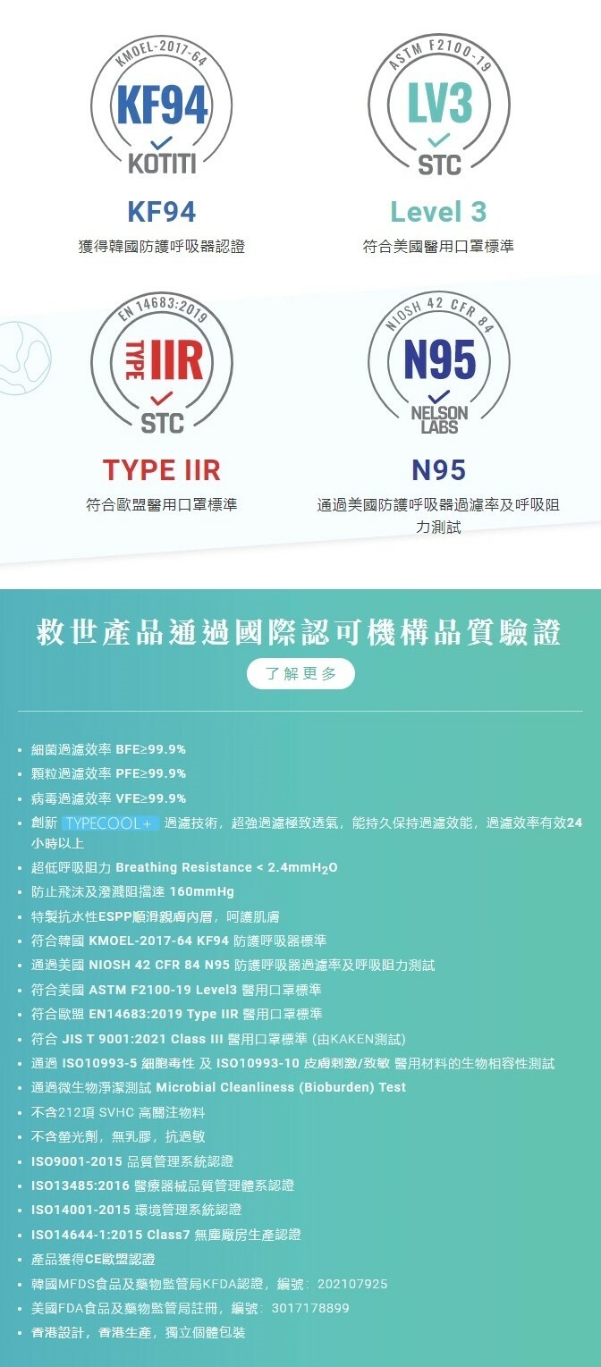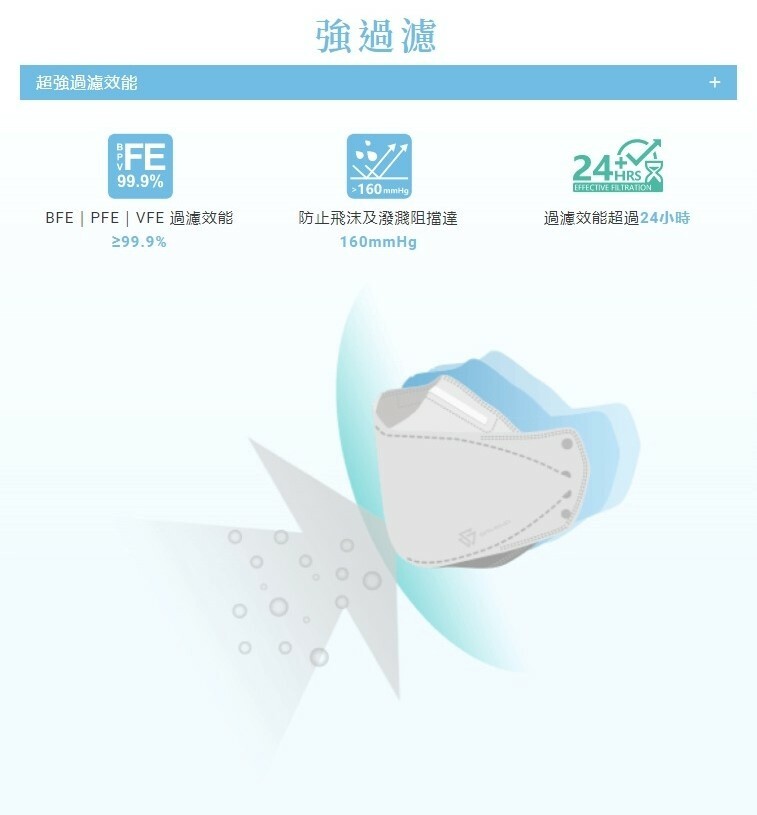口罩採用創新TypeCool+過濾技術,有效過濾99.9%細菌、微塵及病毒,持續效能長達24小時。呼吸阻力低於 2.4mmH2O,保證呼吸暢順。並符合韓國KF94,歐盟Type IIR 醫用口罩標準、及美國ASTM Level 3 規格。