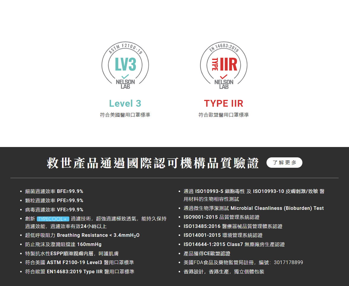 用上特製ESPP親膚順滑底層,絕不起毛,呵護肌膚。符合美國  ASTM LEVEL3及歐盟  EN14683:2019 Type IIR醫用口罩標準。