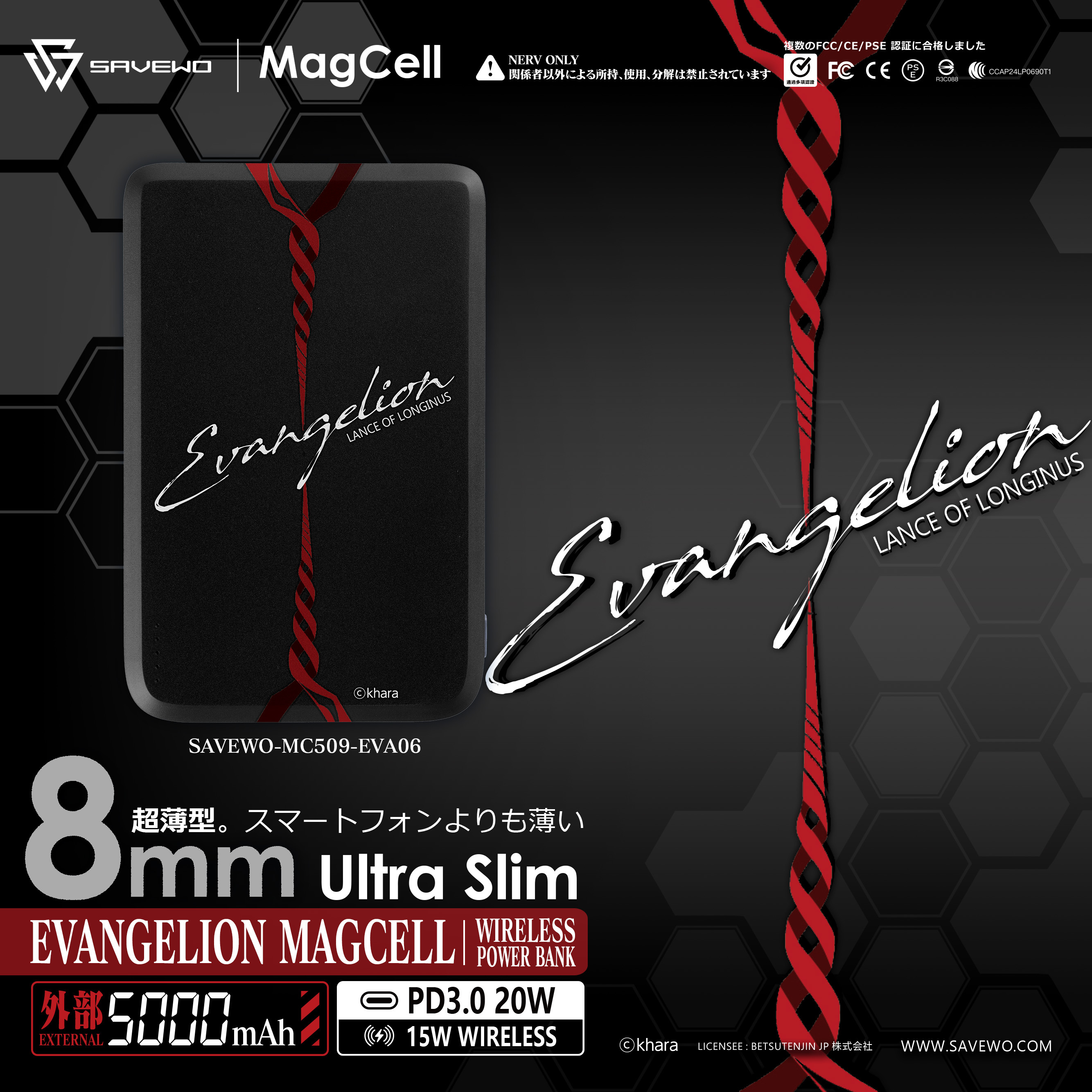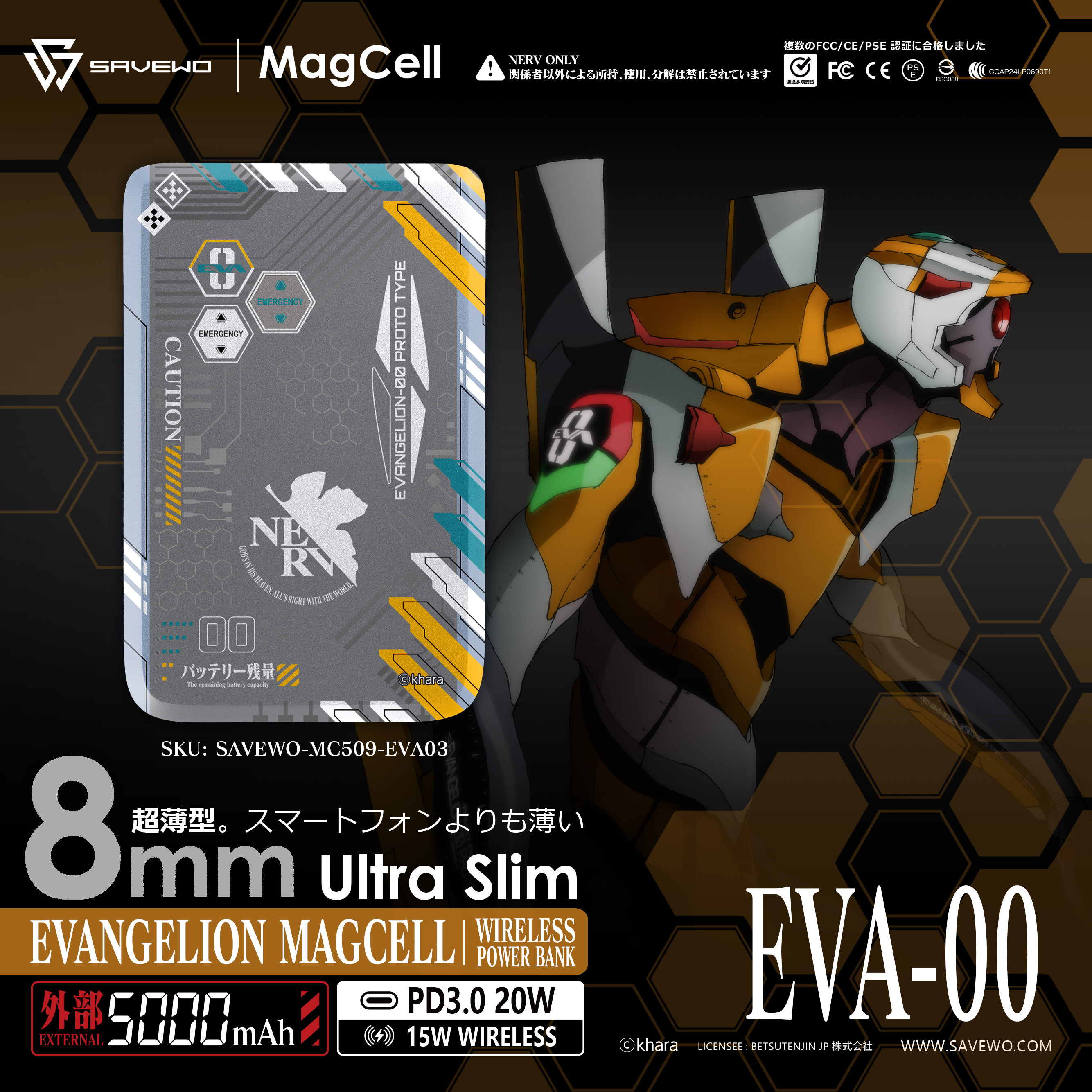 SAVEWO 聯成EVANGELION,推出EVA 特別超薄無綫充電池!EVANGELION MagCell 擁有8mm超薄厚度、115g超輕重量🪶,就如EVA機體流線型設計一樣輕巧靈活;2秒迅速激活充電,可以同機體產生絕對同步率,加上5000mAh 19.3Wh無虛標容量、最高15W高速無線充電,令大家脫離陷入電量不足,而需要限時作戰嘅困境!