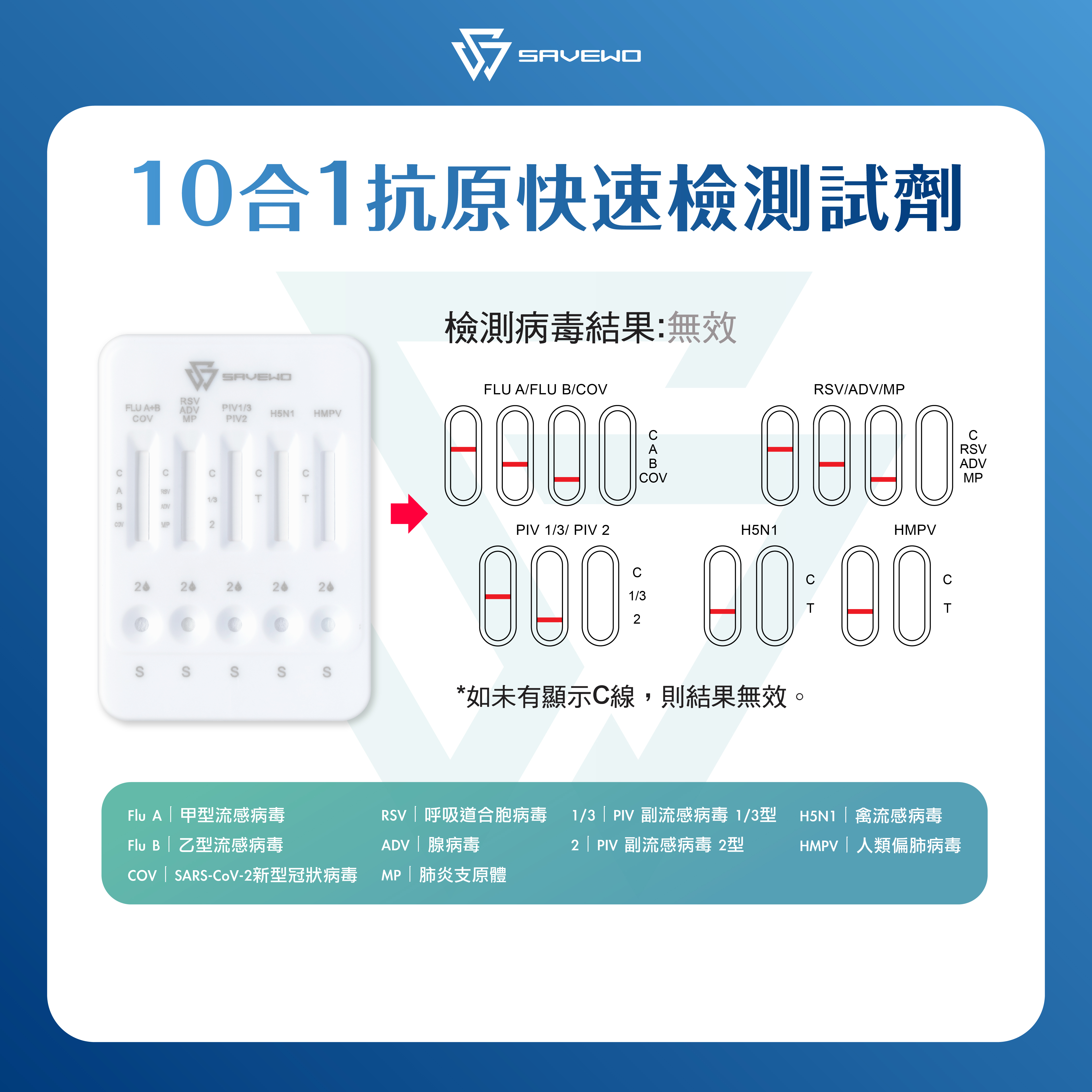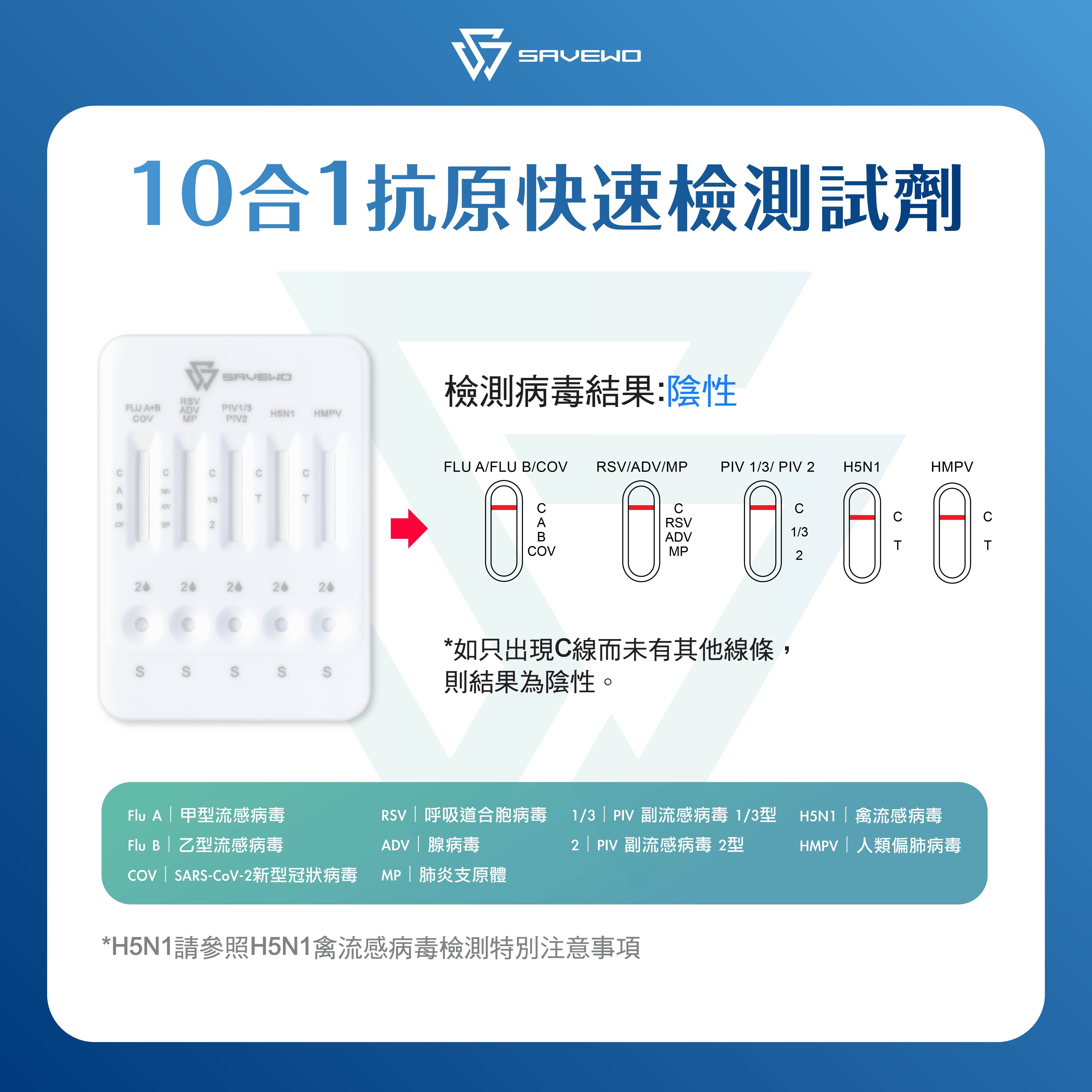 *1支裝* SAVEWO 十合一抗原快速檢測試劑 (新型冠狀病毒(Covid-19) / 人類偏肺病毒 / 肺炎支原體 / 合胞病毒 / 腺病毒 / 副流感1/3型 / 副流感2型 / 甲型流感 / ⼄型流感 / 禽流感)