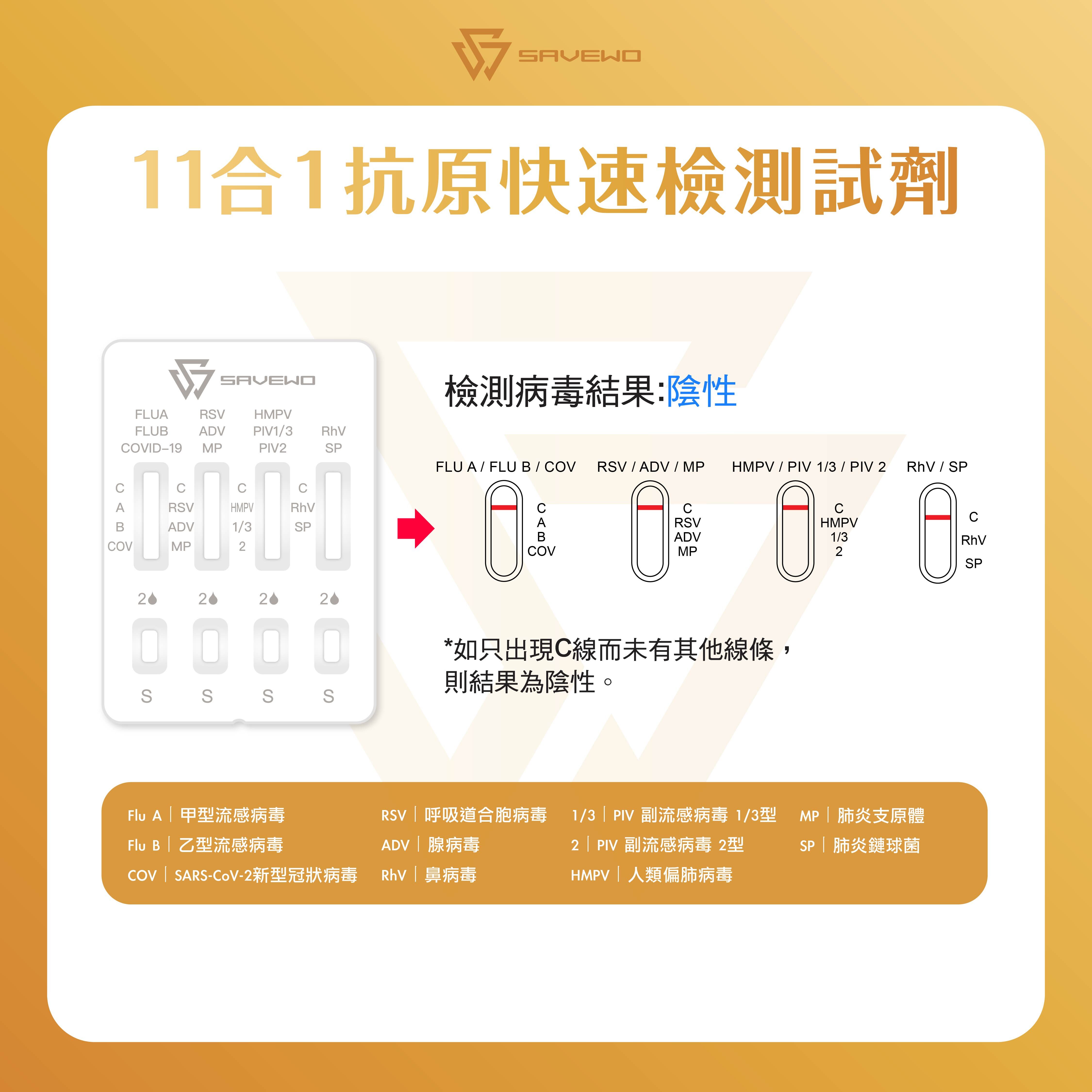 SAVEWO全新推出的11合1抗原快速檢測劑,涵蓋超過 90% 流行性呼吸道疾病,涵蓋hMPV人類偏肺病毒、RhV鼻病毒、新型冠狀病毒(COVID-19)、甲型流感、乙型流感、肺炎鏈球菌、肺炎支原體、副流感病毒 1/3 型、副流感病毒 2 型、RSV呼吸道合胞病毒及腺病毒,對應絕大部分日常急性呼吸道感染個案。