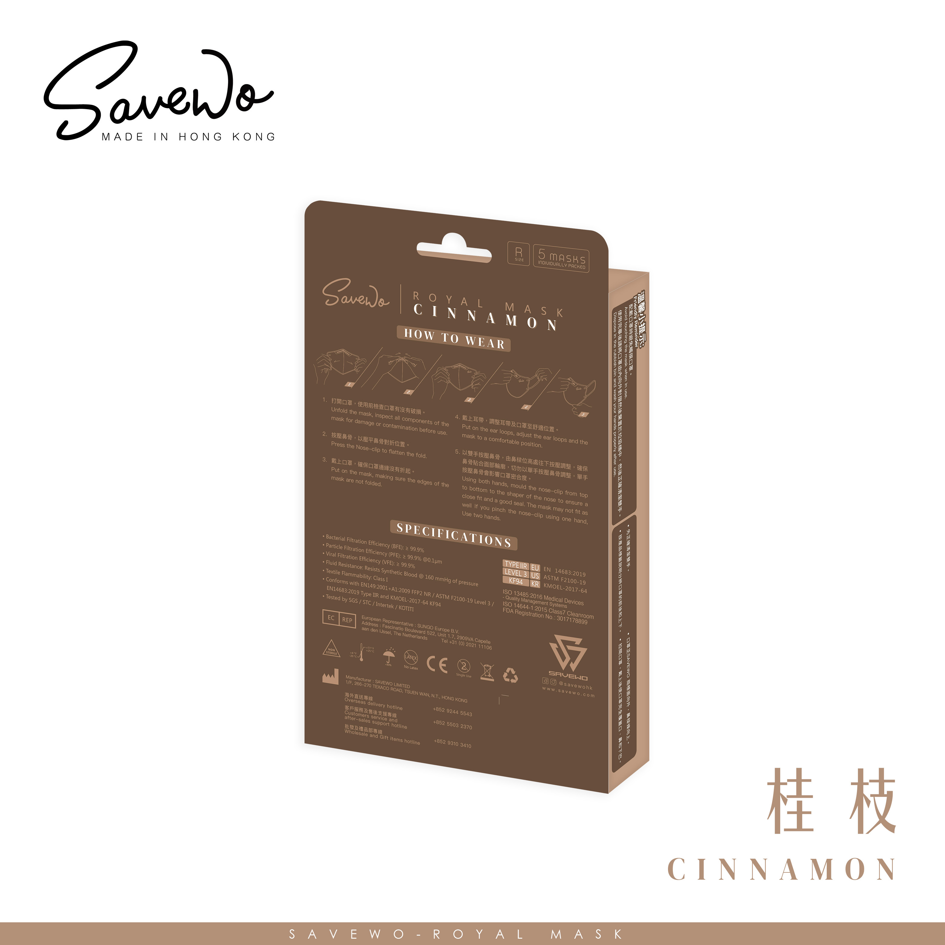 *R 標準碼 旅行裝* SAVEWO ROYAL MASK 救世 2D 對摺型口罩 桂枝「KF94 + KN95 + ASTM LEVEL3 認證 」(5片獨立包裝/盒)
