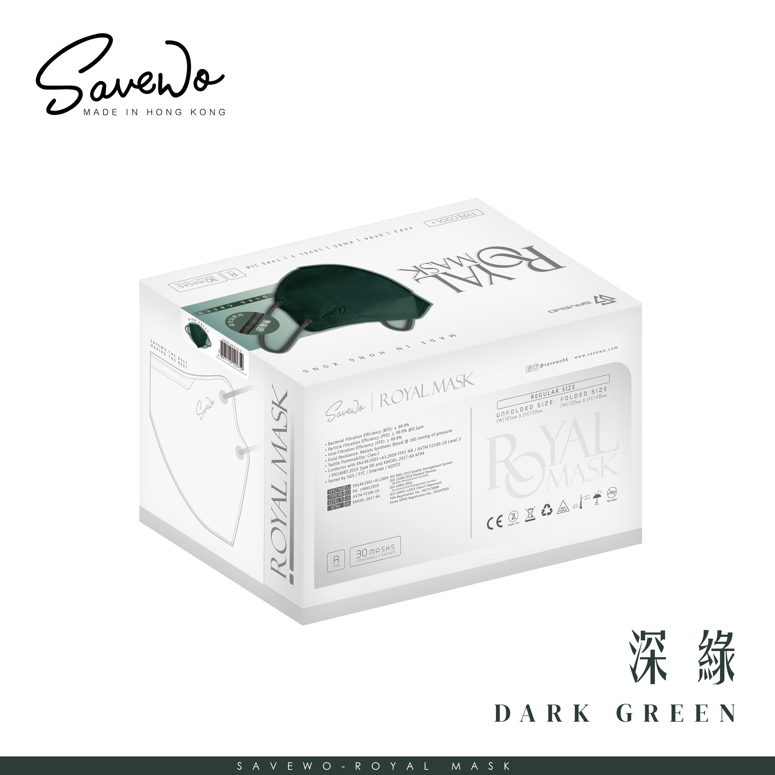 *R 標準碼* SAVEWO ROYAL MASK 救世 2D 對摺型口罩 深綠「KF94 + KN95 + ASTM LEVEL3 認證 」(30片獨立包裝/盒)