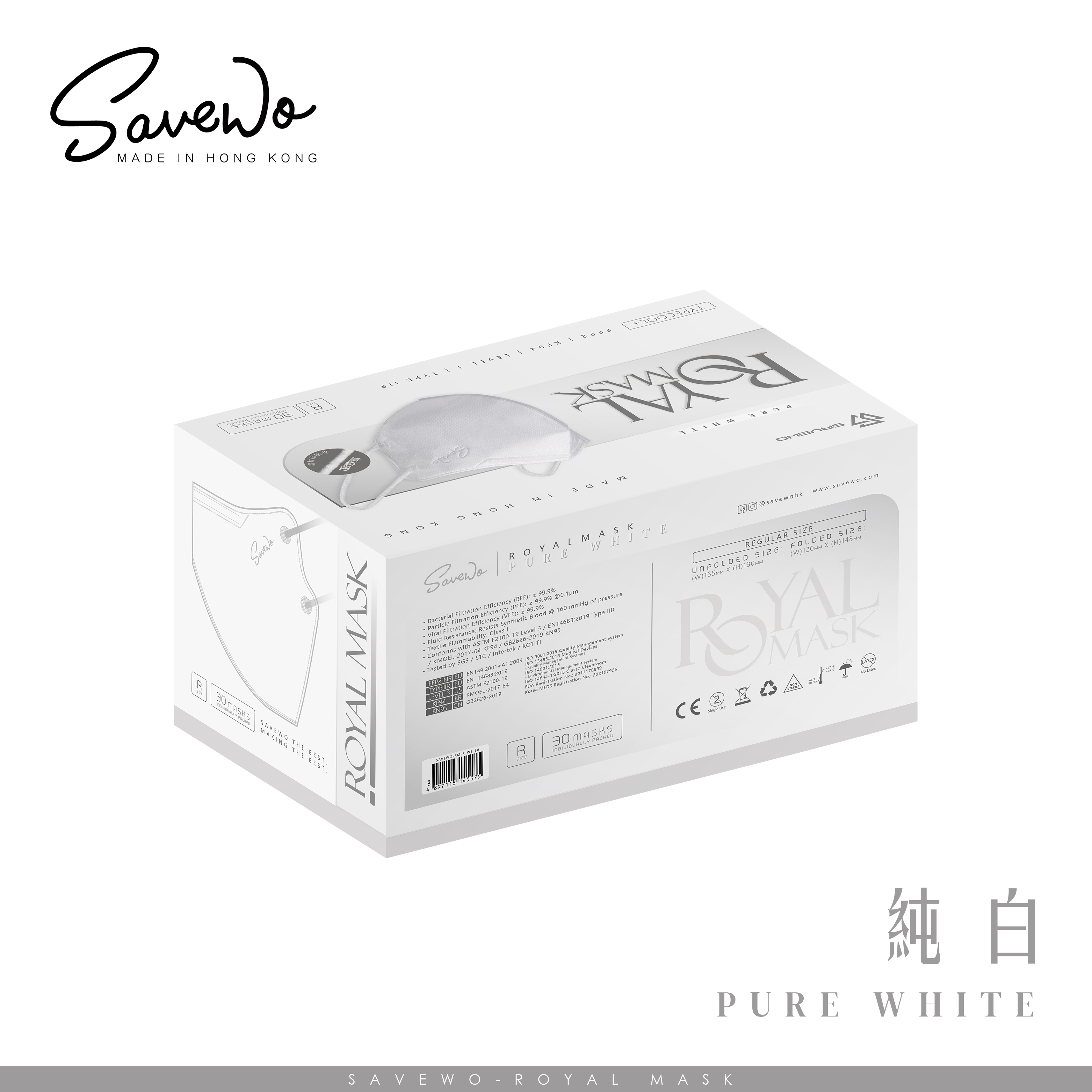 *R 標準碼* SAVEWO ROYAL MASK 救世 2D 對摺型口罩 純白「KF94 + KN95 + ASTM LEVEL3 認證 」(30片獨立包裝/盒)
