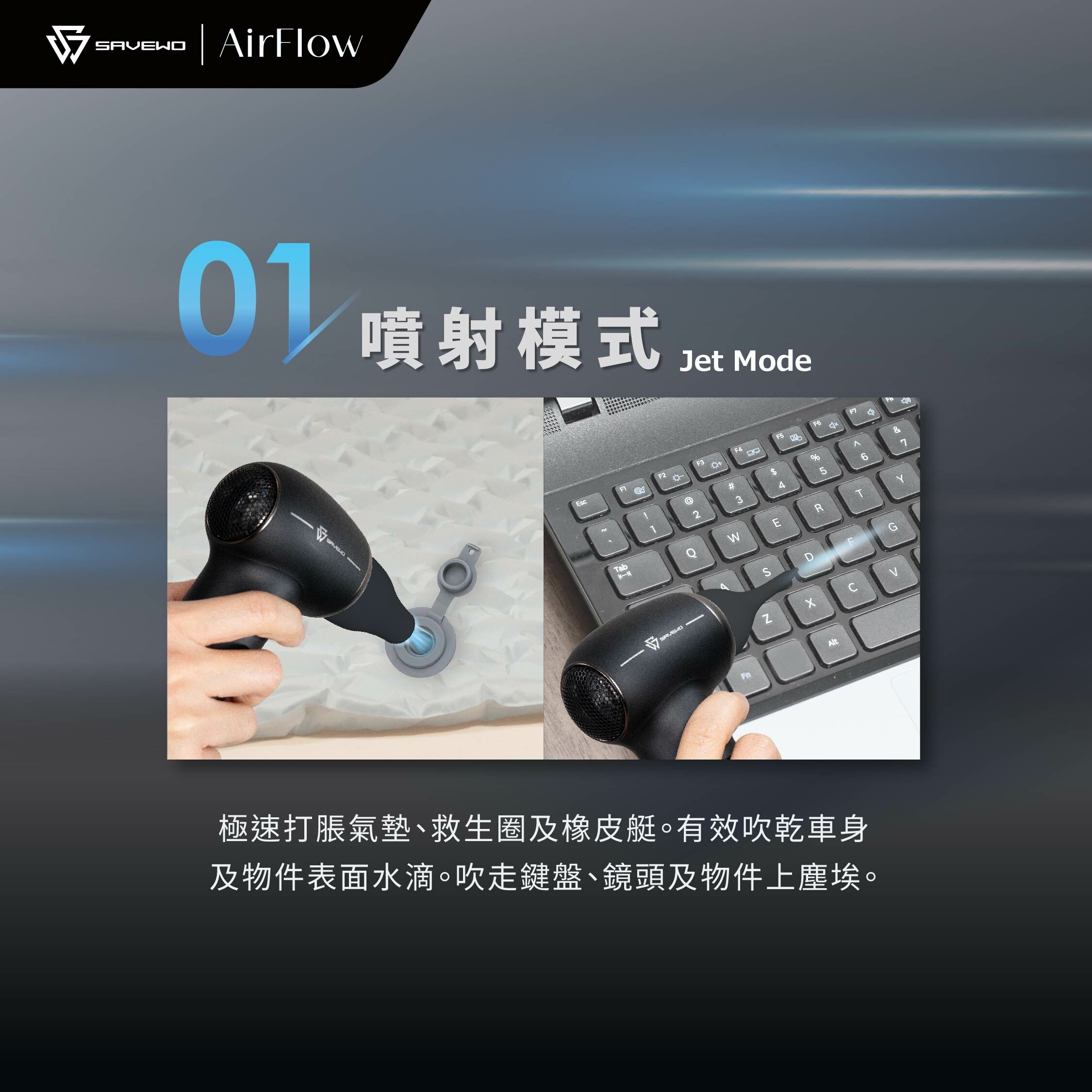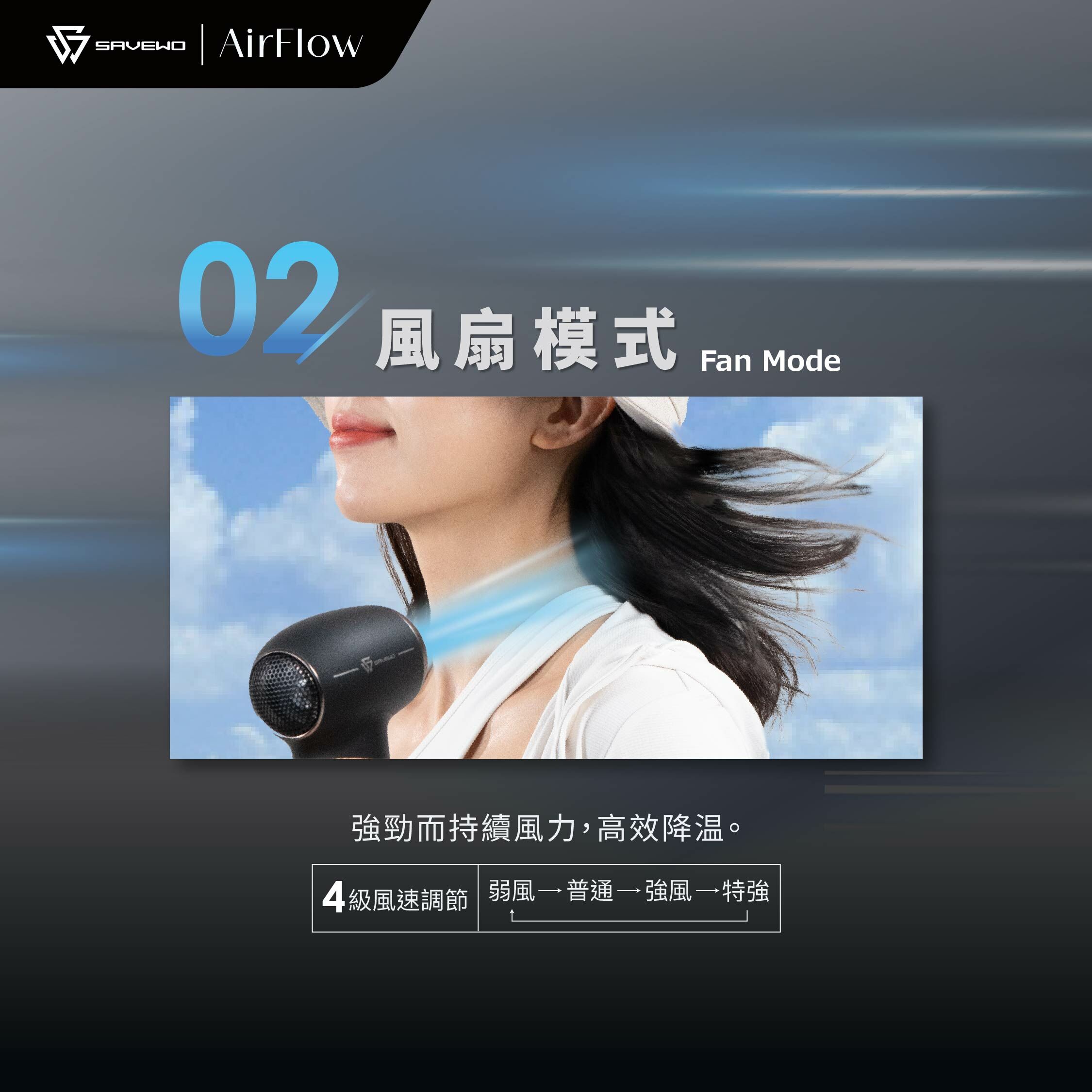 SAVEWO AirFlow Jet Fan 細小輕巧,卻可以暴發超強風力!性能稱皇!設有三種模式,由強力噴射、風扇至高效抽風,迎合你喺唔同場合嘅需要,一機多用,邊個話風扇只係得送風咁簡單?