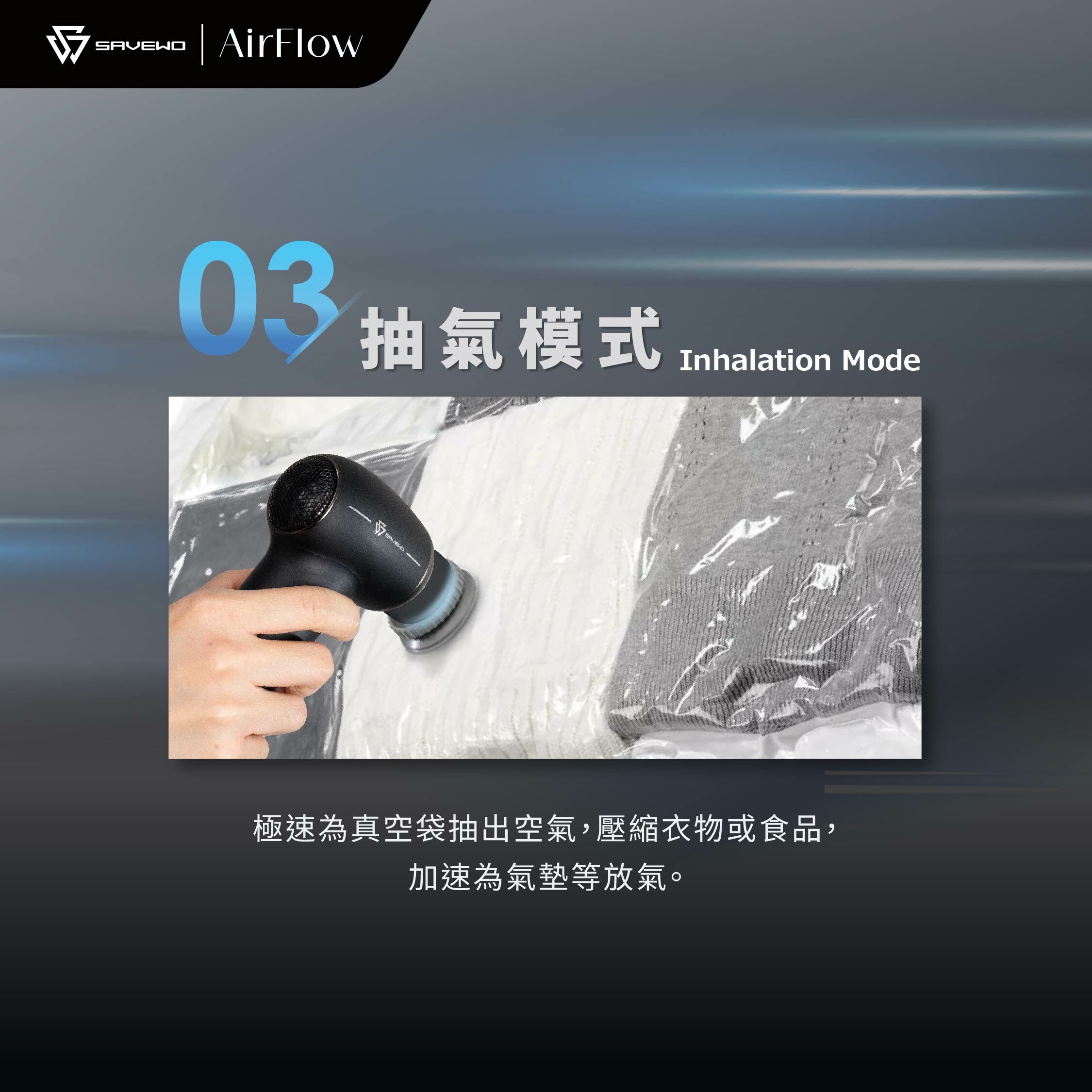 抽風模式可以輕鬆實現真空包裝,輕鬆打包乾貨食品或整理衣物,節省空間嘅同時保持物品新鮮。無論是準備旅行,還是家庭收納都非常方便。