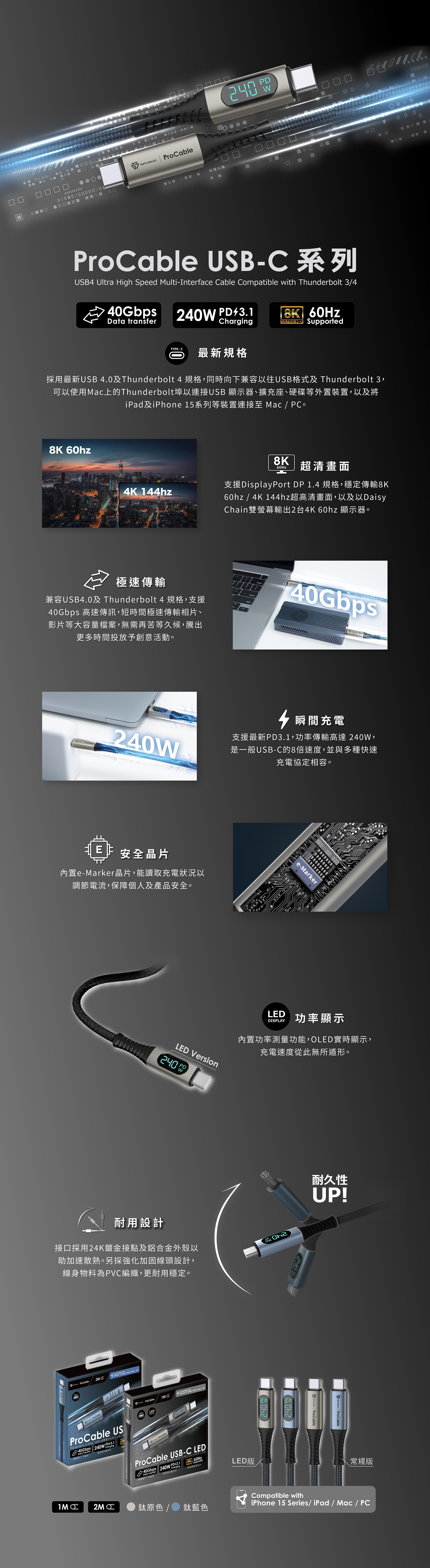 *1米* SAVEWO ProCable USB-C LED 功率顯示USB4 Thunderbolt 4 極速充電傳輸線(兩色可選)