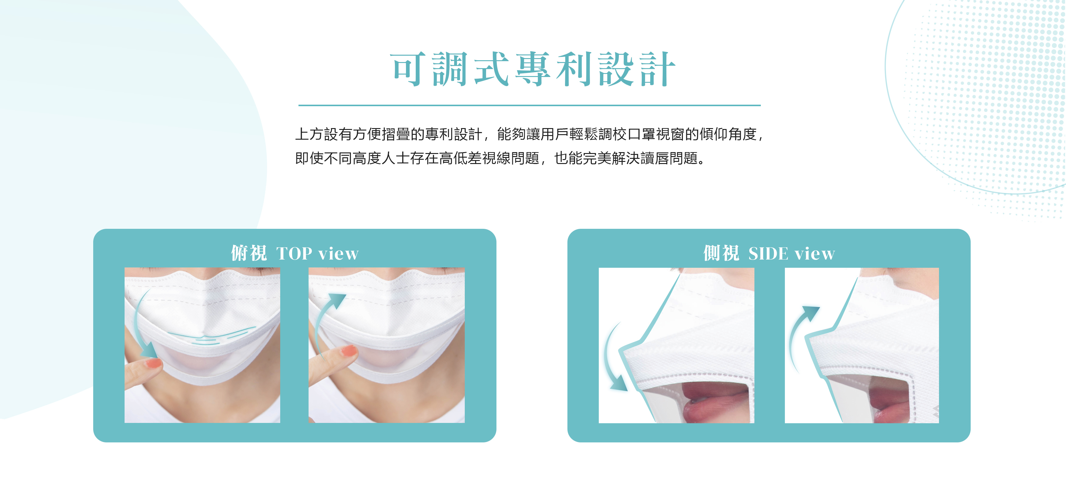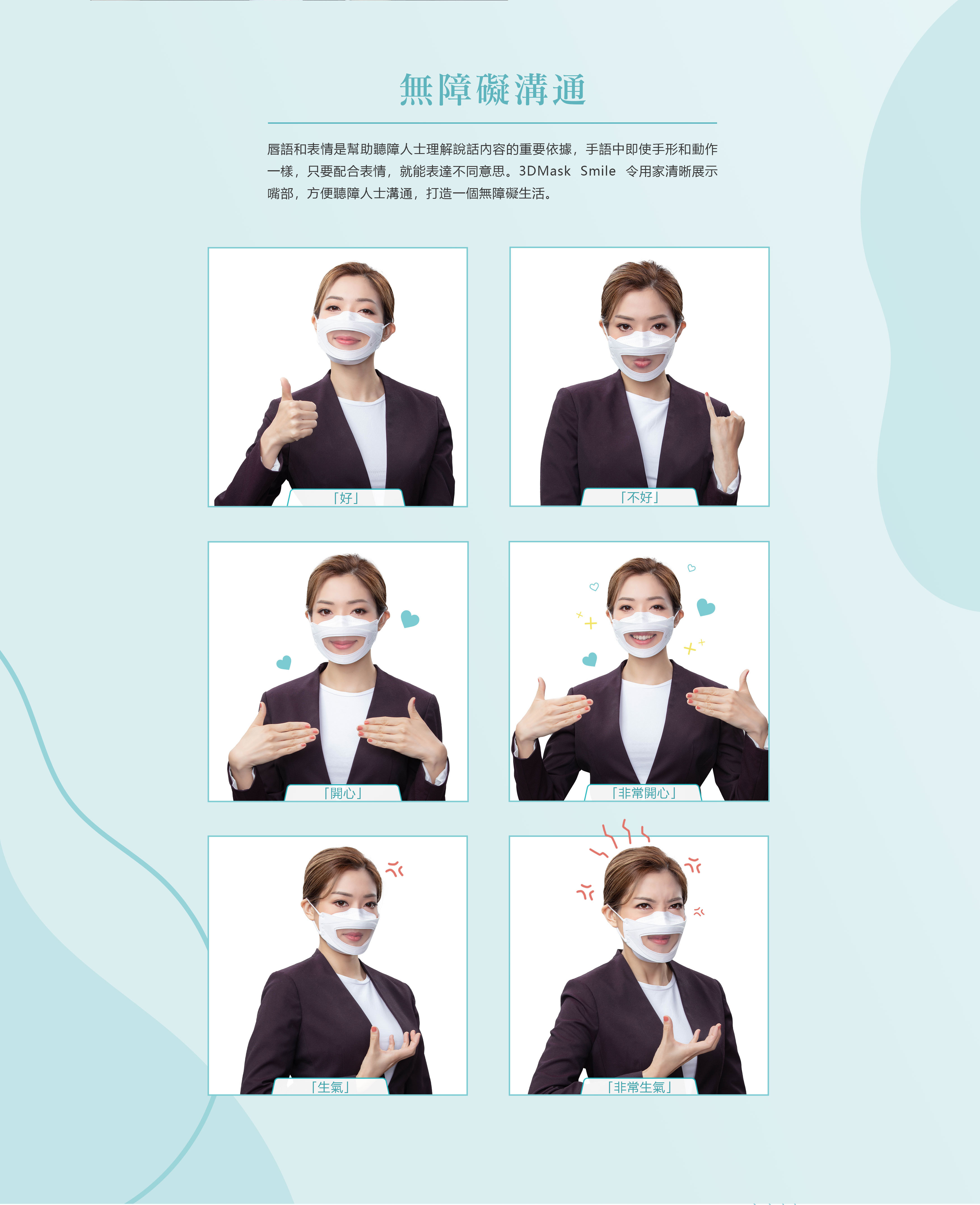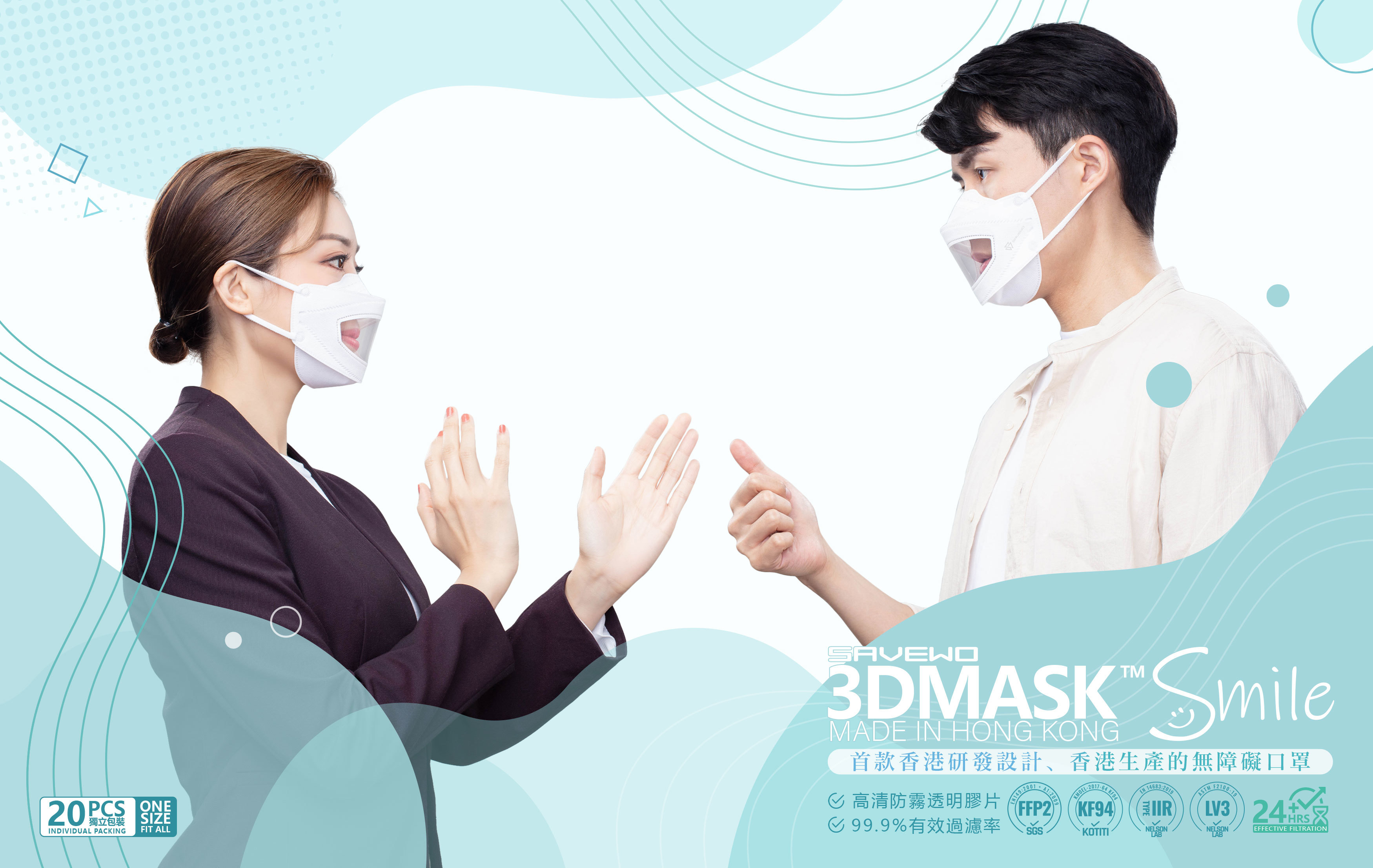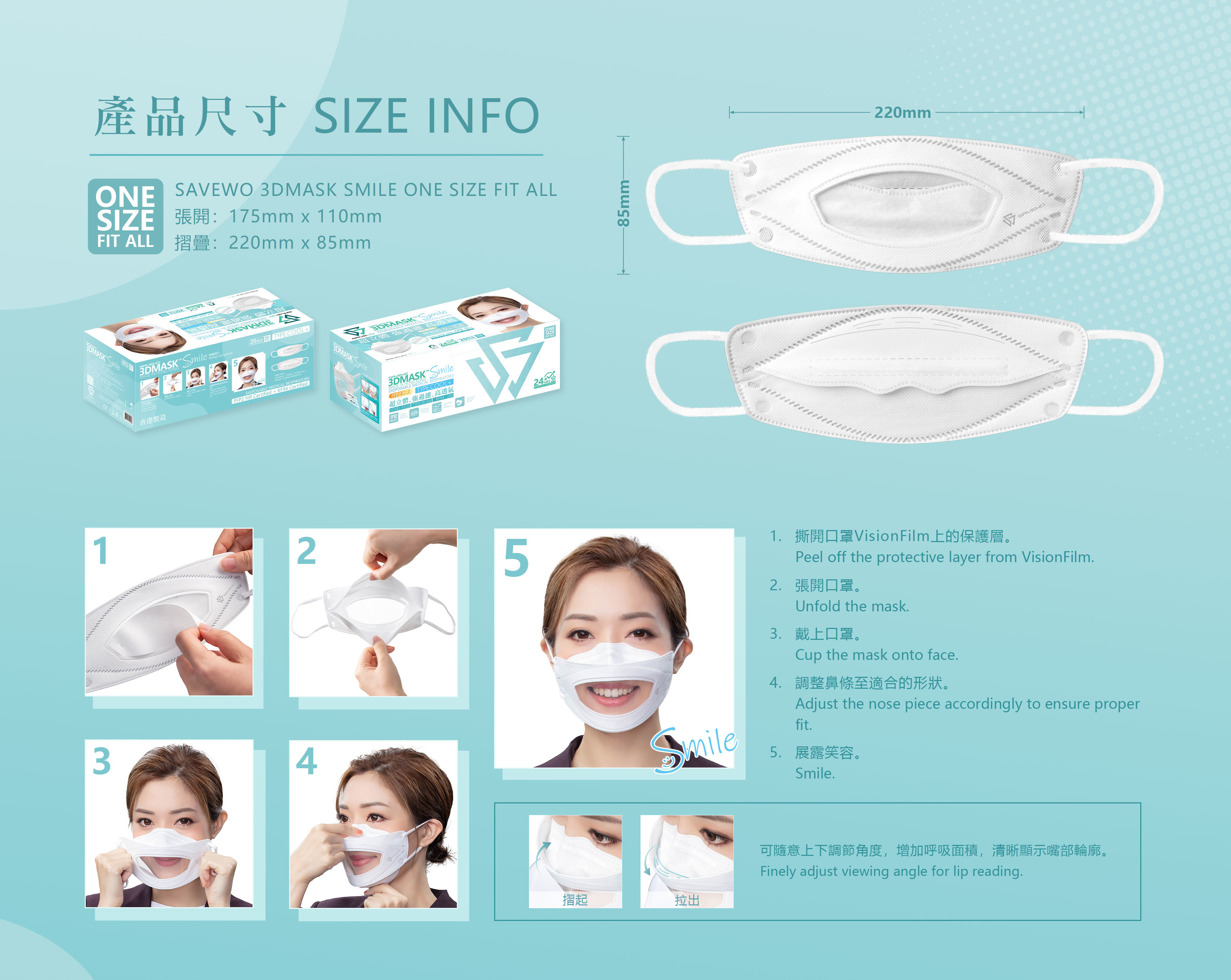 SAVEWO 3DMASK Smile 的口罩設計採用3DMASK Extreme Pro的V-Shape 專利設計改良而成,加上FleXnet 專利支撐物料,提供超立體堅挺的剪裁,更貼合人的面型。上方設有方便摺疊的專利設計,能夠讓用戶輕鬆調校口罩視窗的傾仰角度,即使不同高度人士存在高低差視線問題,也能完美解決讀唇問題。