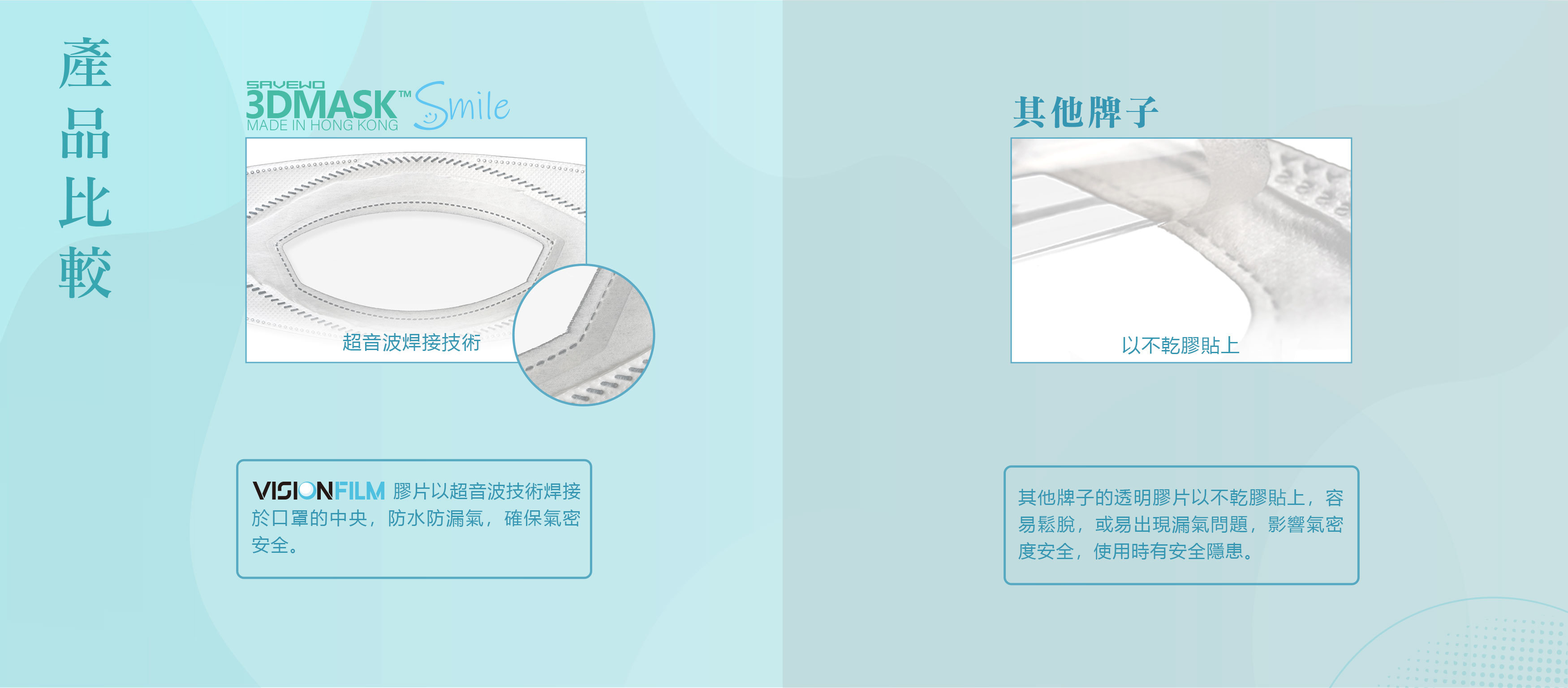 全新研發的SAVEWO VisionFilm 超高清防霧視窗專利技術,在口罩中間嘴部位置形成廣角透明視窗,能多角度展示用家的嘴部。VisionFilm 膠片以超音波技術焊接於口罩的中央,防水防漏氣,確保氣密安全。VisionFilm具有高清防霧氣功能,無論用家說話甚至做運動,也𣎴會出現任何霧化。