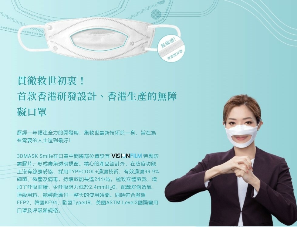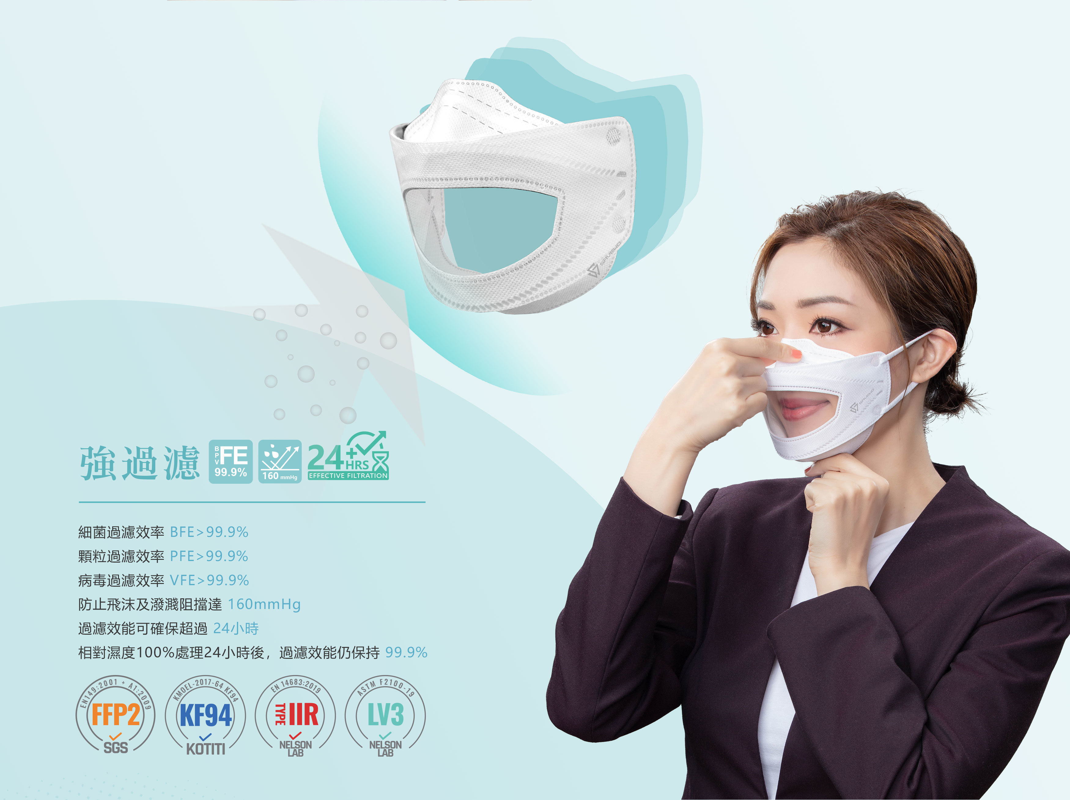 精心的產品設計外,3DMASK Smile 在防疫功能上沒有絲毫妥協,採用SAVEWO TypeCool+ 過濾技術,有效過濾99.9%細菌、微塵及病毒,持續效能長達24小時。極致立體剪裁,增加了呼吸面積,極低呼吸阻力,配戴舒適透氣,能輕鬆應付一整天的使用時間。同時符合歐盟FFP2、韓國KF94、歐盟 TypeIIR 、美國ASTM Level 3 國際醫用口罩及呼吸器規格。