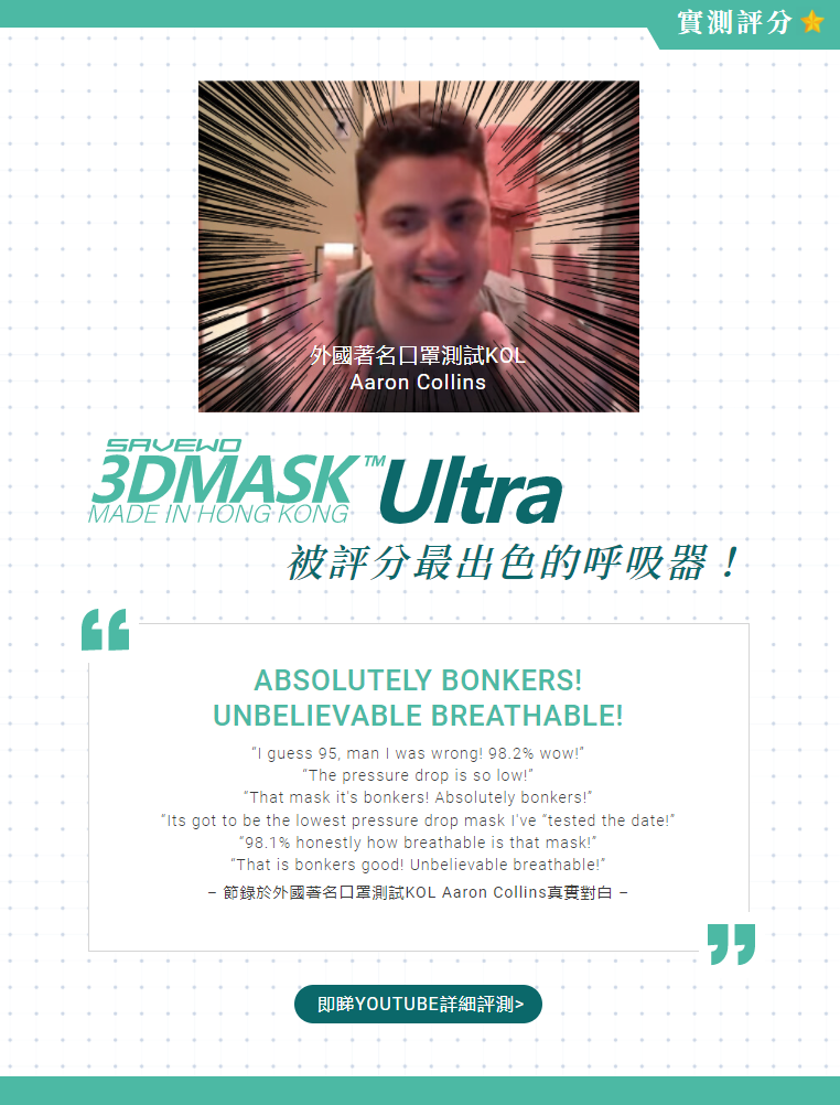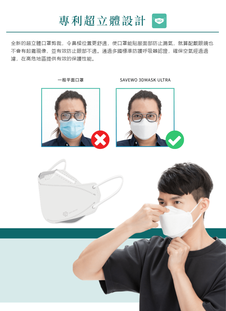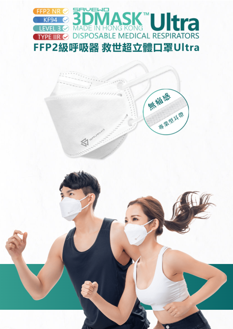 SAVEWO 3DMASK Ultra 救世超立體口罩是嶄新的即棄式防護呼吸器及醫用口罩,結合多種救世創新科技,通過各種嚴格的測試,擁有極高的過濾性能,特製的立體剪裁,彈性無痛寬耳帶,超低的呼吸阻力,即使長時間穿戴也十分舒適。無論功能及使用體驗均力臻完美。