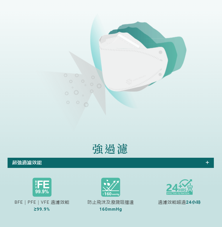 TypeCool+過濾技術,超低呼吸阻力只有< 2.4mmH2O,僅為傳統呼吸器的三分之一。得益於不受濕氣影響的嶄新駐極技術,能持久保持過濾效能,於相對濕度100%處理24小時後,過濾效率變化不足0.1%,仍可有效過濾99.9%細菌、微塵及病毒。