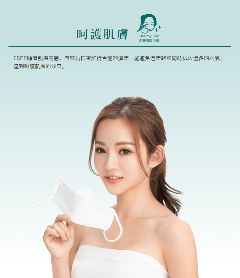 ESPP順滑親水性內層,有效為口罩維持合適的濕度,能避免過度乾燥同時排放過多的水氣,達到呵護肌膚的效果。