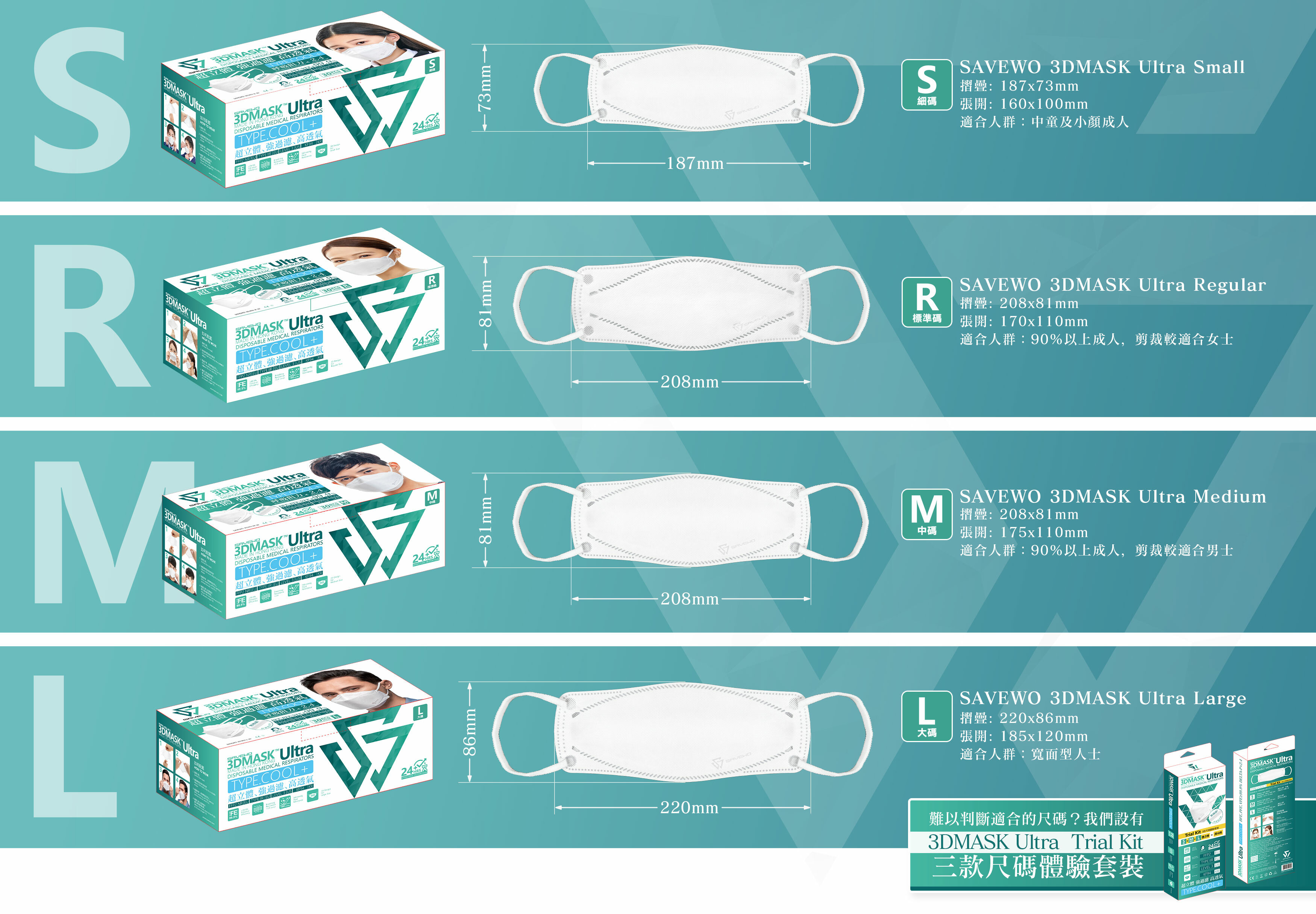 SAVEWO 3DMASK Ultra 設有四款尺寸,對應不同的人群,準確提供完美的保護。