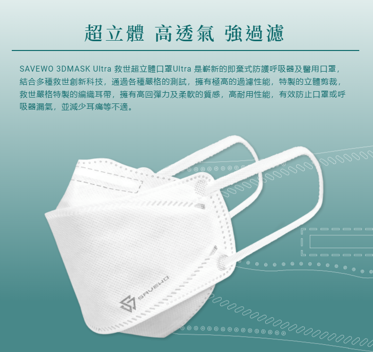 SAVEWO 3DMASK Ultra 救世超立體口罩是嶄新的即棄式防護呼吸器及醫用口罩,結合多種救世創新科技,通過各種嚴格的測試,擁有極高的過濾性能,特製的立體剪裁,彈性無痛寬耳帶,超低的呼吸阻力,即使長時間穿戴也十分舒適。無論功能及使用體驗均力臻完美。