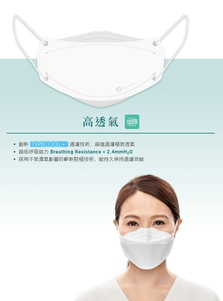 TypeCool+過濾技術,超低呼吸阻力只有< 2.4mmH2O,僅為傳統呼吸器的三分之一。得益於不受濕氣影響的嶄新駐極技術,能持久保持過濾效能,於相對濕度100%處理24小時後,過濾效率變化不足0.1%,仍可有效過濾99.9%細菌、微塵及病毒。