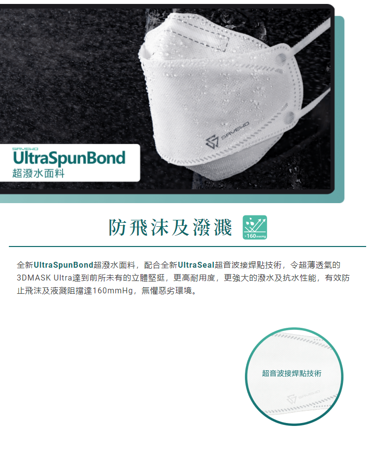 UltraSpunBond 超潑水面料,配合UltraSeal 超音波接焊點技術,令超薄透氣的3DMASK Ultra 達到前所未有的立體堅挺,更高耐用度,無懼惡劣環境,以及更強大的潑水及抗水性能,防止飛沫及液濺阻擋達160mmHg。