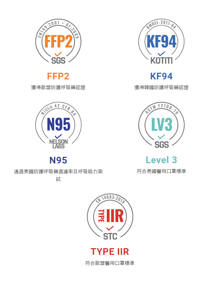 本產品符合歐盟 EN149:2001+A1:2009 FFP2 及韓國 KF94 防護呼吸器標準,並通過美國Niosh 42 CFR 84 N95 防護呼吸器過濾率及呼吸阻力測試。同時符合美國ASTM LEVEL3 及歐盟EN14683:2019 Type IIR 醫用口罩標準。