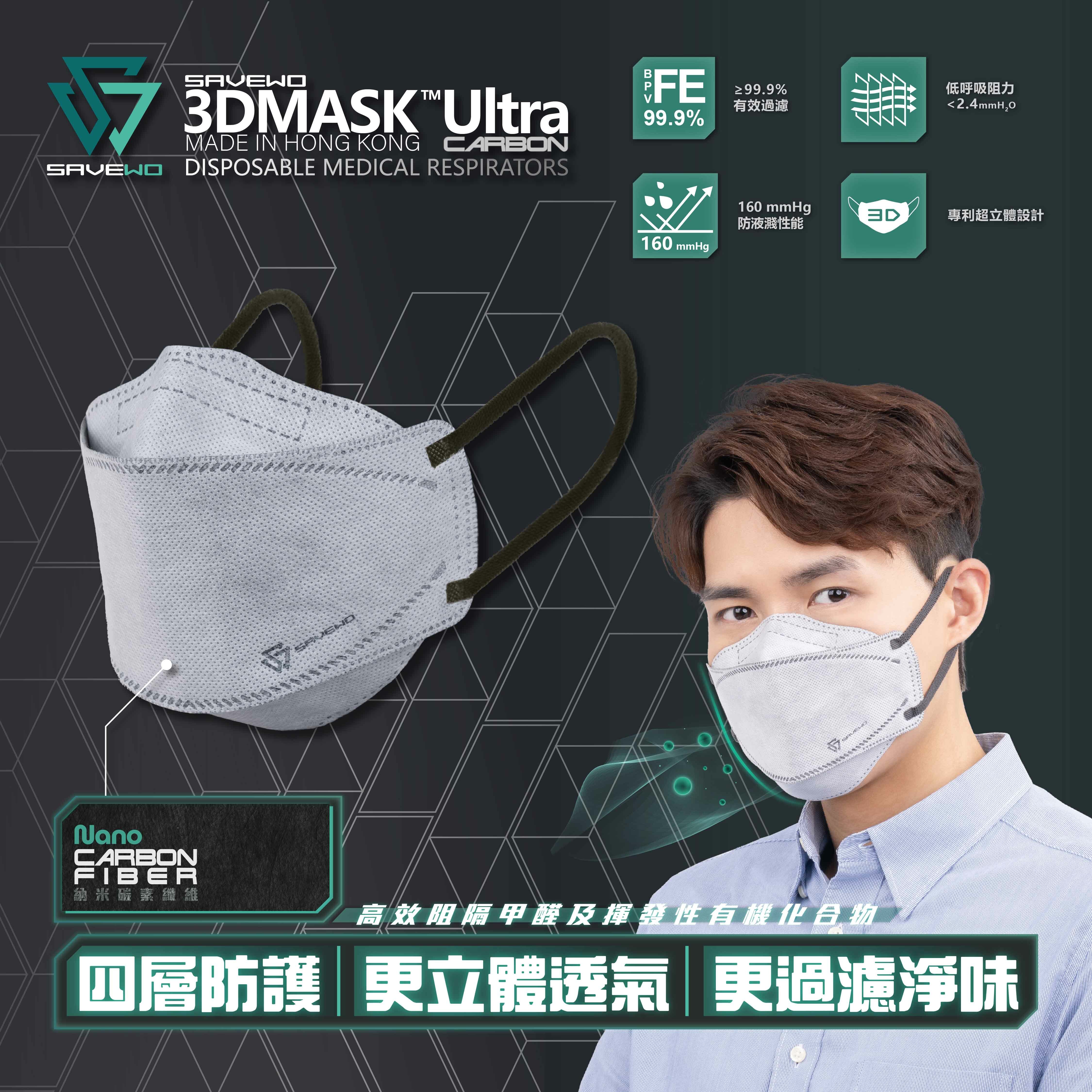 因應有需要人士的需求,救世一直未有停低研發腳步。新推出3D Mask Ultra Carbon,在原有3D Mask Ultra基礎之上,再特設活性碳過濾零異味層,可高效過濾揮發性有機化合物、二氧化物、甲苯、甲醛、氨等有害物質,同時可過濾口氣及異味,時刻令你感覺清新。