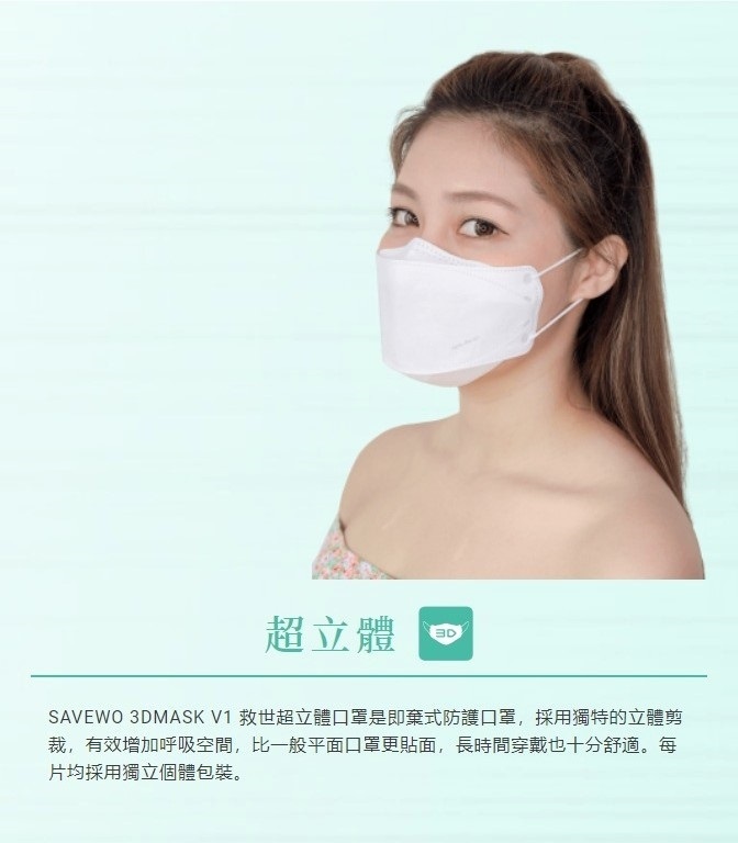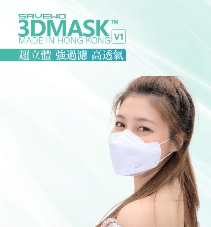 SAVEWO 3DMASK V1 救世超立體口罩是即棄式防護口罩,採用獨特的立體剪裁,有效增加呼吸空間,加上超彈性常規耳帶,比一般平面口罩更貼面,長時間穿戴也十分舒適。採用TypeCool 清涼型通氣技術,超低呼吸阻力 Breathing Resistance< 2.8mmH2O,防止飛沫及液濺阻擋達120mm Hg,有效過濾99.9%細菌、微塵及病毒。每片均採用獨立個體包裝,自用送禮都一流!