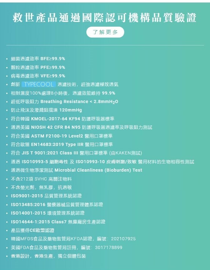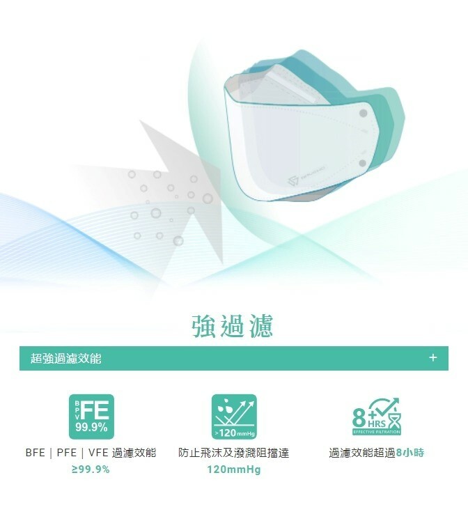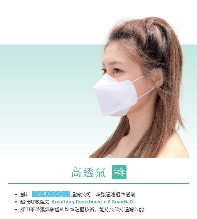• 創新TypeCool 過濾技術,超強過濾極緻透氣,能持久保持過濾效能,過濾效率有效 8小時以上